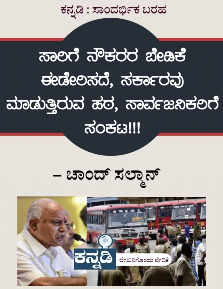 ಈ ಮಾತನ್ನು ಮುಖ್ಯಮಂತ್ರಿ ಯಡಿಯೂರಪ್ಪ ಅಂದು ಬಿಜೆಪಿ ರಾಜ್ಯಾಧ್ಯಕ್ಷರಿದ್ದಾಗ ಹೇಳಿದ್ದು ಈಗ ತಮ್ಮದೇ ಅಧಿಕಾರವಿದೆ ತಾವೇ ಮುಖ್ಯಮಂತ್ರಿಯಾಗಿದ್ದಾರೆ ಸಾರಿಗೆ ನೌಕರರ ಬೇಡಿಕೆ ಈಡೇರಿಸಬಹುದಲ್ಲವೇ? ಅಂದು ಮಾತನಾಡಿದ್ದು ಕೇವಲ ಅಧಿಕಾರಕ್ಕಾಗಿಯೇ? ಸಾರಿಗೆ ನೌಕರರ ಬೇಡಿಕೆ ಈಡೇರಿಸದೇ ನೌಕರರೊಂದಿಗೆ ಸರ್ಕಾರವು ಮಾಡುತ್ತಿರುವ ಹಠ, ಸಾರ್ವಜನಿಕರಿಗೆ ಸಂಕಟವುಂಟು ಮಾಡುತ್ತಿದೆ.